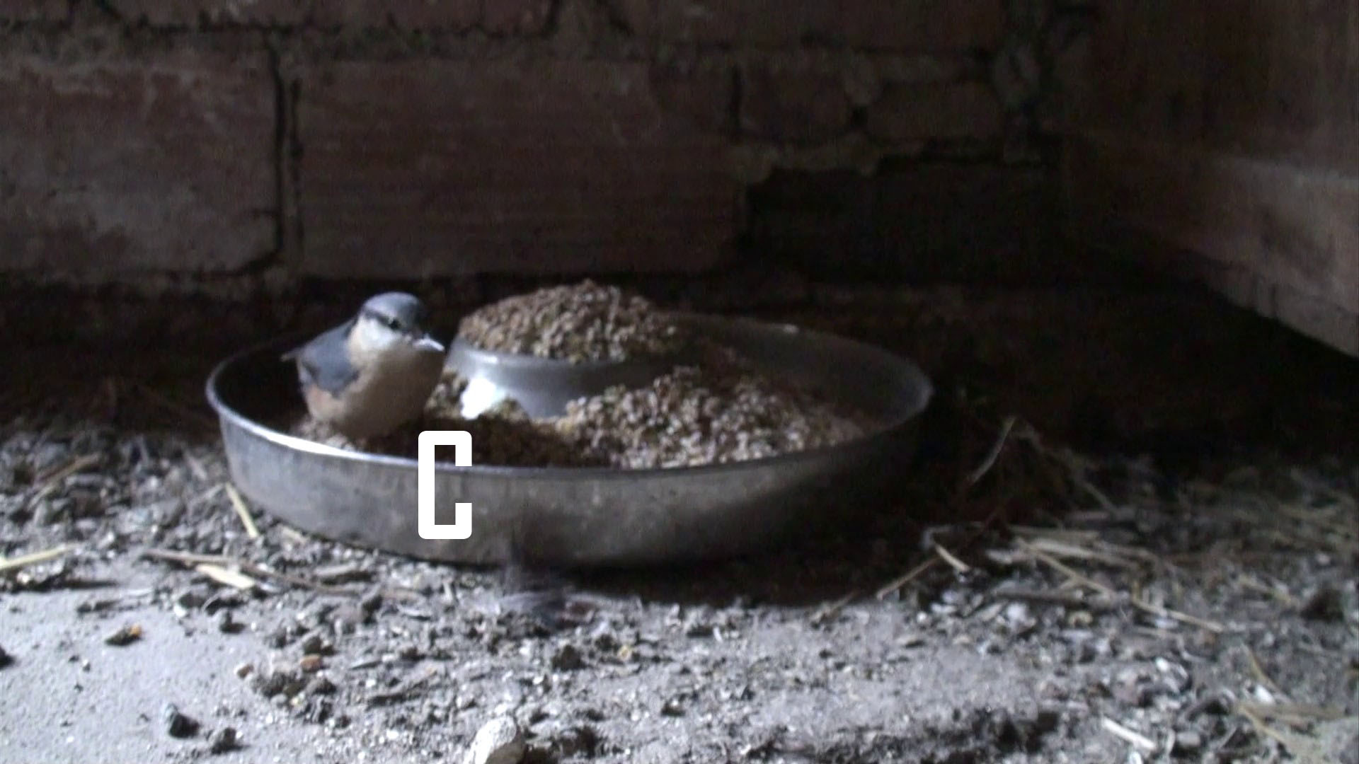 Bird stealing chicken food and fruits.