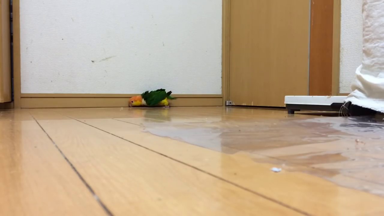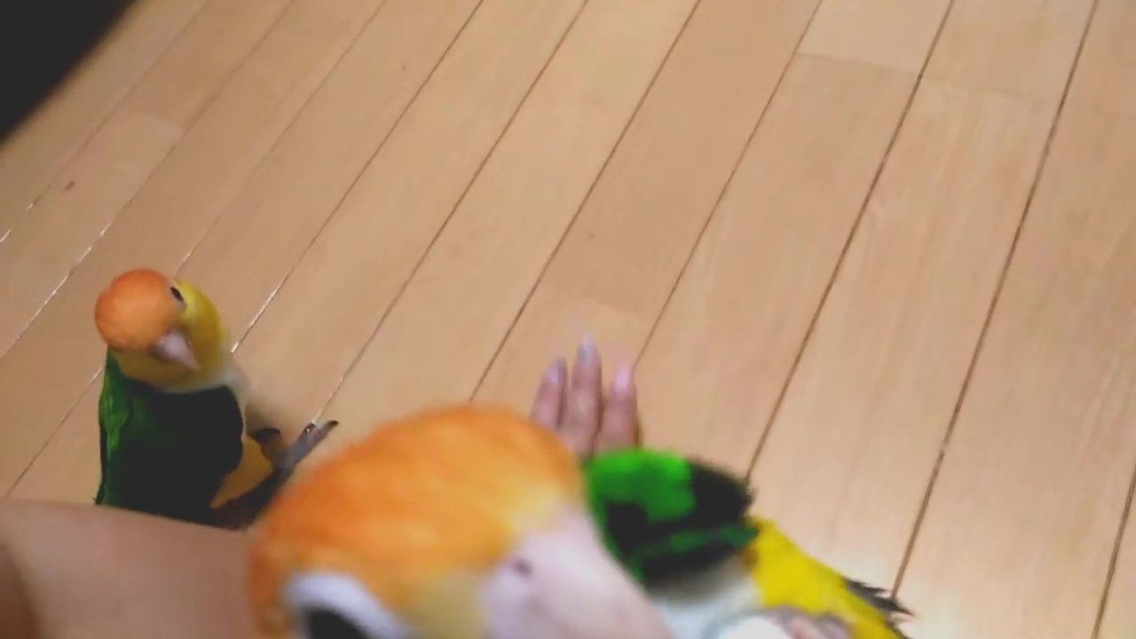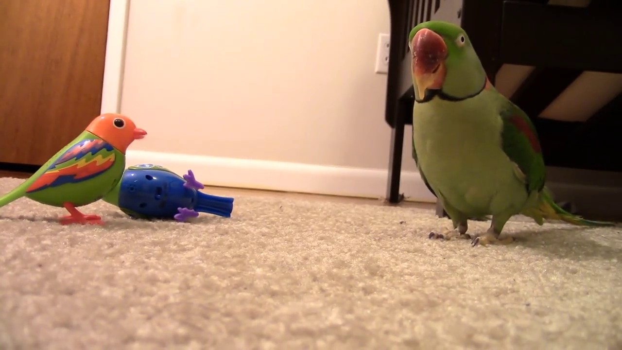 Parrot attacking toy parrots.